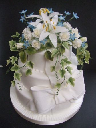 白いユリとバラ、アイビーとブルースター、大きなリボン!