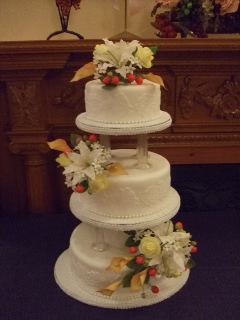 清楚な白い3段のウエディングケーキに、大きな白百合とオレンジ色のカラー、黄色のバラ、